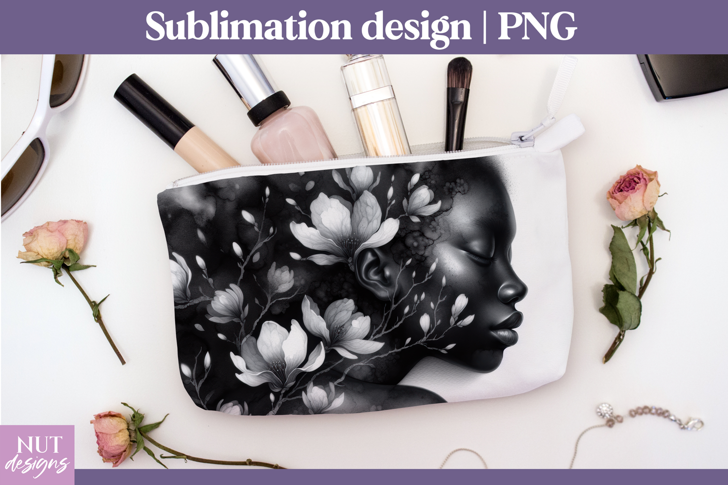 This floral woman silhouette PNG features a graceful profile adorned with blooming flowers and botanical details in stunning monochrome tones. Perfect for sublimation projects, cosmetic bags, makeup pouches, and printable decor, this elegant and feminine digital download blends beauty and nature in a dreamy, romantic style. Ideal for chic accessories, stylish gifts, and modern crafting creations.