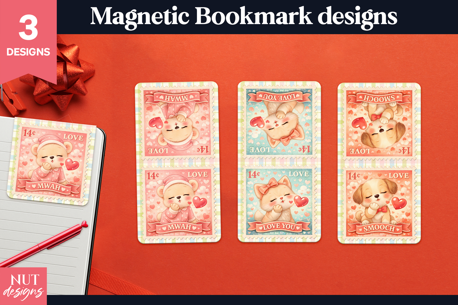 These Cute Valentine Magnetic Bookmarks feature adorable pastel animal stamp designs with sweet love phrases like “Mwah,” “Love You,” and “Smooch.” Perfect for book lovers, planners, and romantic gifts, these printable PNG bookmark designs are ideal for DIY magnetic bookmarks, Valentine’s Day crafts, and stationery projects. A charming digital download for readers who love cute, kawaii-style designs.