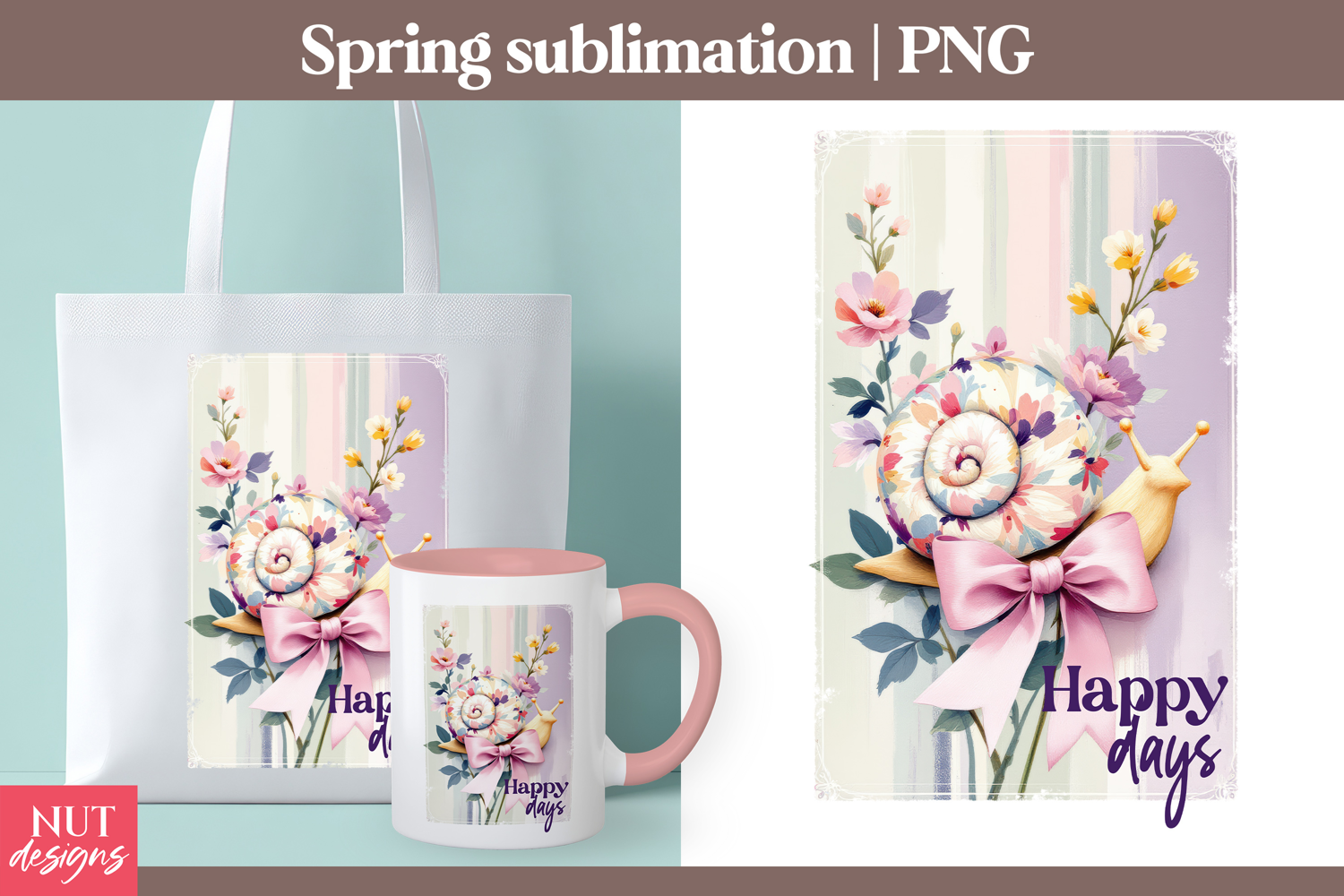 This Happy Days Floral Snail PNG features a charming pastel snail adorned with delicate spring flowers and a soft pink bow, set against a gentle striped background. Designed in a whimsical cottagecore style, this printable digital file is perfect for sublimation on shirts, mugs, tote bags, and farmhouse decor. A cute and colorful spring design ideal for seasonal gifts, DIY crafts, and cheerful garden-inspired projects.