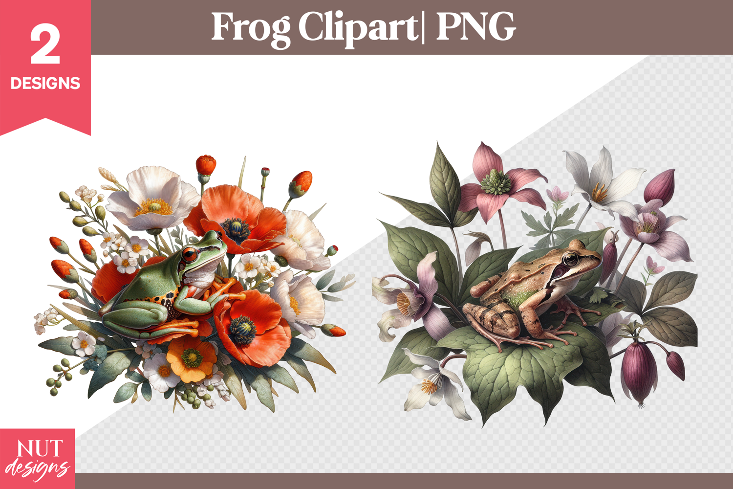 This Floral Frog Clipart PNG set features two beautifully detailed frog illustrations surrounded by lush botanical blooms. One design showcases a vibrant green frog resting among warm poppy flowers, while the other highlights a natural brown frog nestled in soft woodland blossoms. These high-resolution printable PNG files are perfect for sublimation, stickers, nursery decor, and whimsical garden-inspired craft projects.