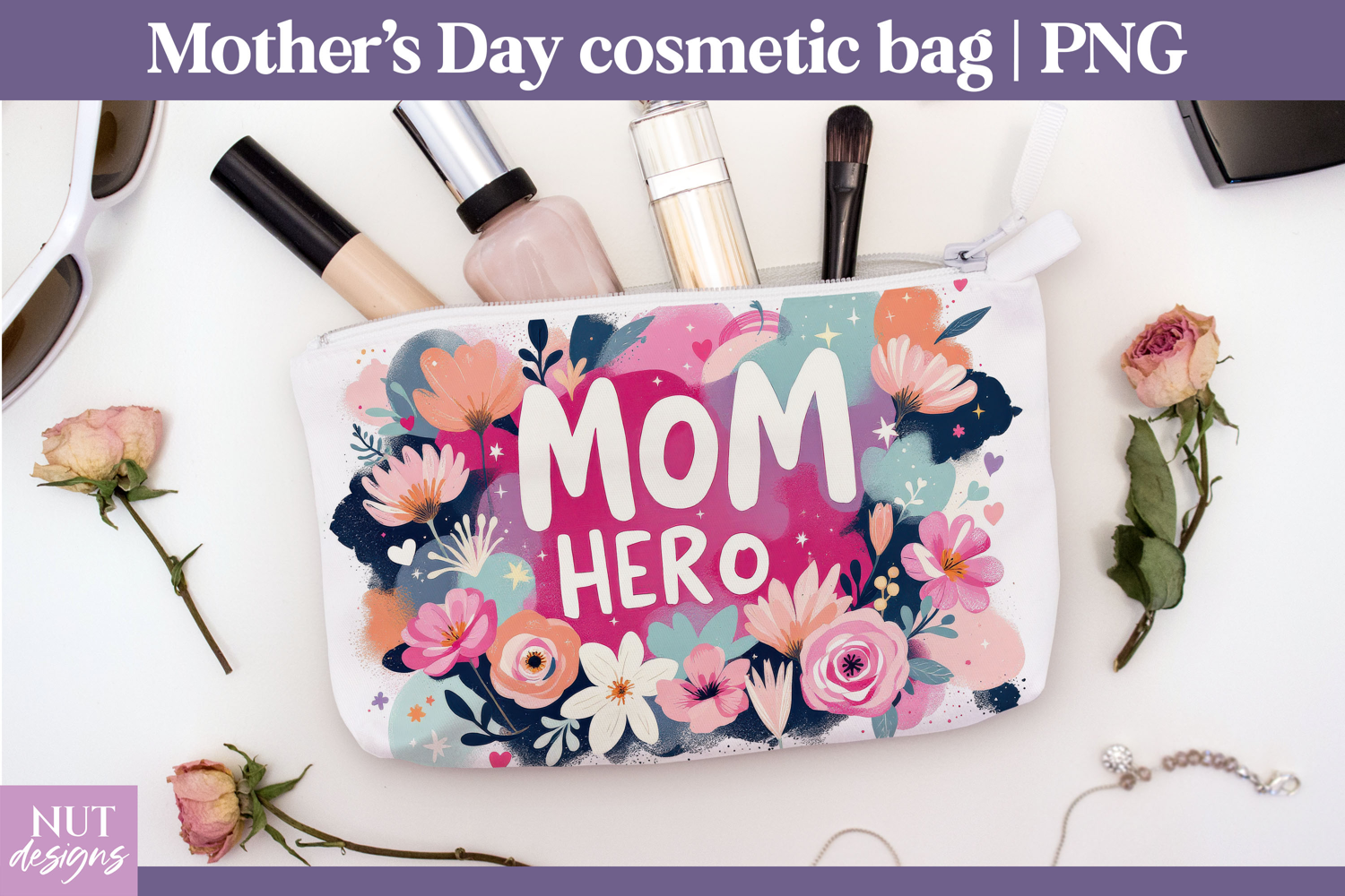 This Mom Hero Floral PNG Design features soft pastel flowers and elegant lettering that celebrate the strength and love of moms. Perfect for cosmetic bags, makeup pouches, tote bags, shirts, mugs, and DIY gifts, this high-resolution PNG file is ideal for sublimation printing and crafting projects. A beautiful floral design created to honor mothers, mamas, and mother figures with warmth, appreciation, and heartfelt style.