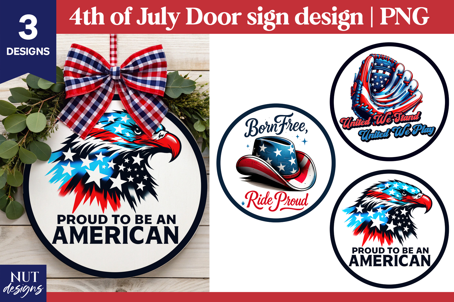 Celebrate Independence Day with this bold patriotic door sign bundle featuring classic American symbols and pride. This set includes a striking eagle “Proud to Be an American” design, a western-style cowboy hat badge, and a baseball glove emblem with a patriotic message. Perfect for creating round door hangers, farmhouse decor, 4th of July decorations, sublimation projects, stickers, and DIY crafts. These PNG designs bring a strong red, white, and blue spirit to your patriotic celebrations.