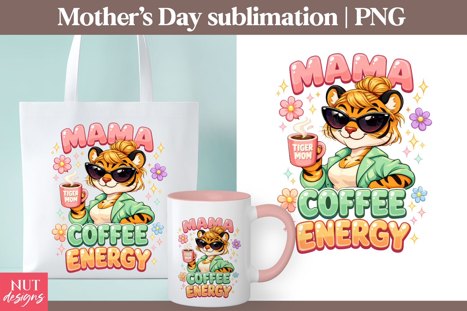 Mothers Day sublimation Mama Coffee Energy Tiger PNG