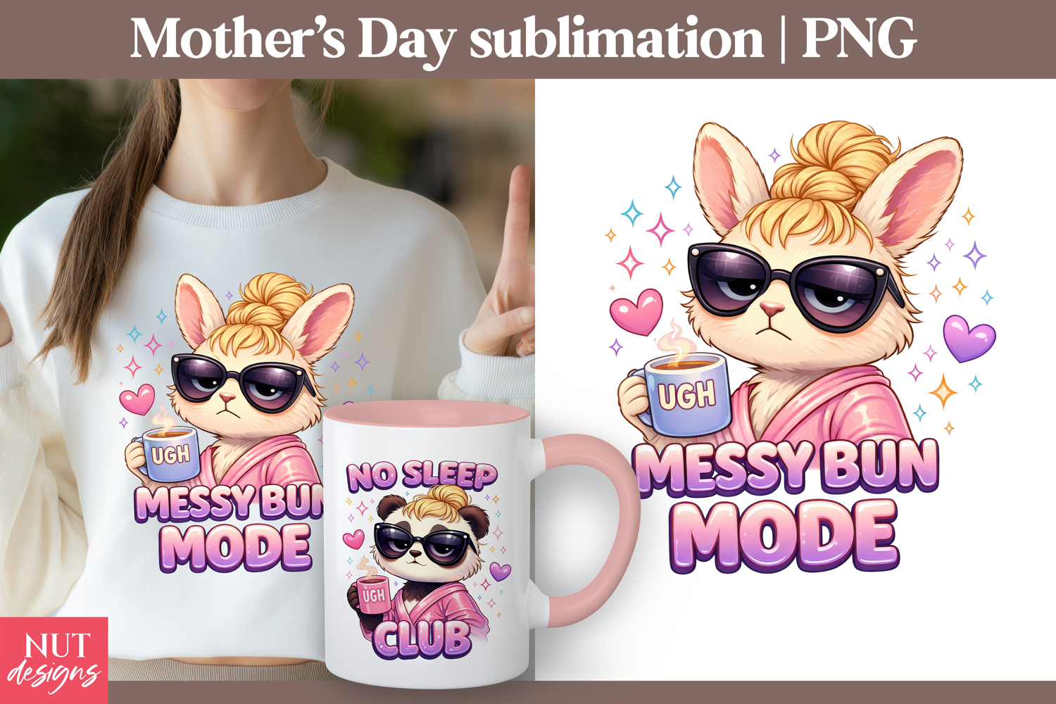 Funny Mothers Day sublimation Messy Bun Mode Mom Bunny