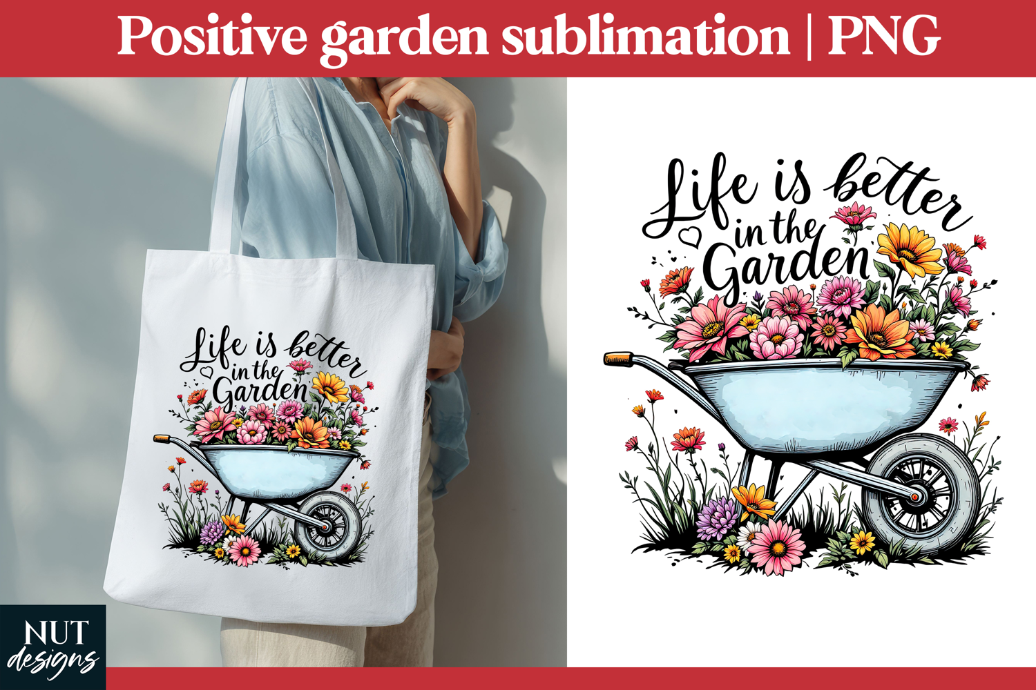 Celebrate the joy of gardening with this charming floral wheelbarrow design featuring the uplifting quote “Life is better in the garden.” Bursting with colorful flowers and rustic detail, this design is perfect for sublimation on totes, shirts, mugs, and more. Ideal for garden lovers and nature enthusiasts, it adds a warm, farmhouse-inspired touch to creative projects and thoughtful handmade gifts.