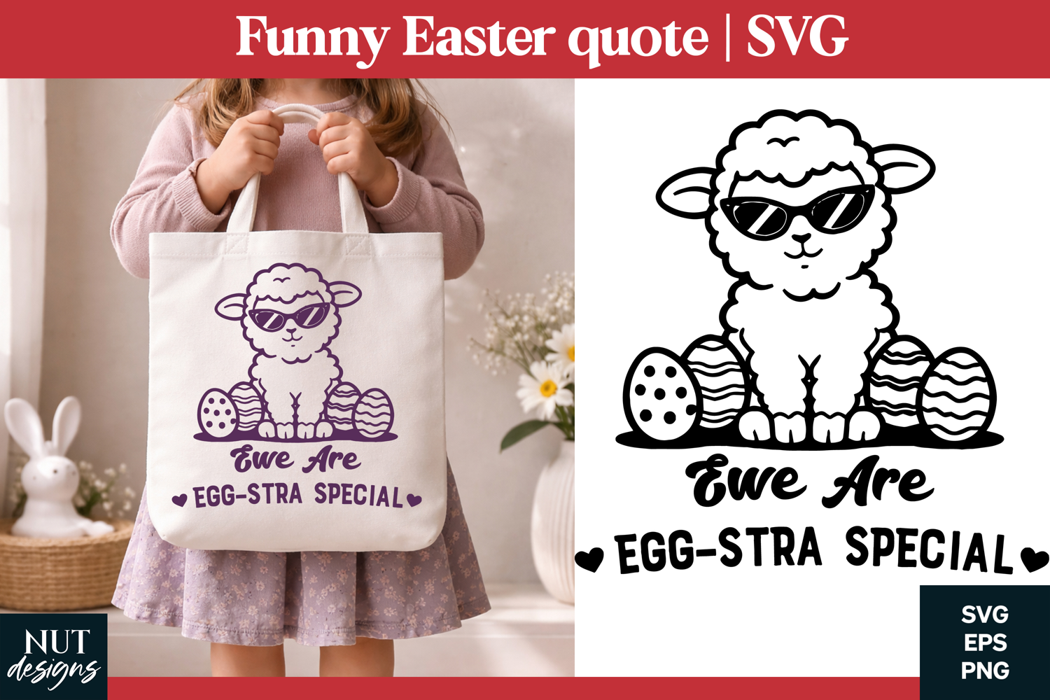 Make your Easter creations extra adorable with this “Ewe Are Egg-stra Special” design! Featuring a cute lamb wearing sunglasses surrounded by festive eggs, this playful and pun-filled illustration is perfect for kids shirts, tote bags, and seasonal crafts. Ideal for Cricut and Silhouette projects, it adds a sweet and cheerful touch to your spring designs and handmade gifts.