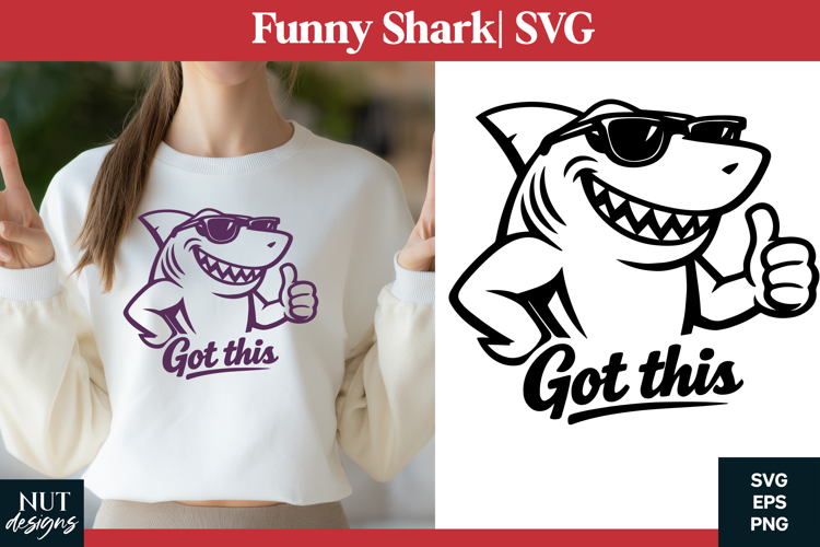 Bring bold personality to your next craft project with this funny shark SVG featuring a cool cartoon shark in sunglasses giving a thumbs up with a confident grin and the phrase Got this. Perfect for cricut, silhouette, printable, decal, tshirt, sticker, and graphic design use, this playful ocean-inspired cutfile adds a humorous and motivational touch to shirts, mugs, bags, and more with a clean outline style that stands out beautifully