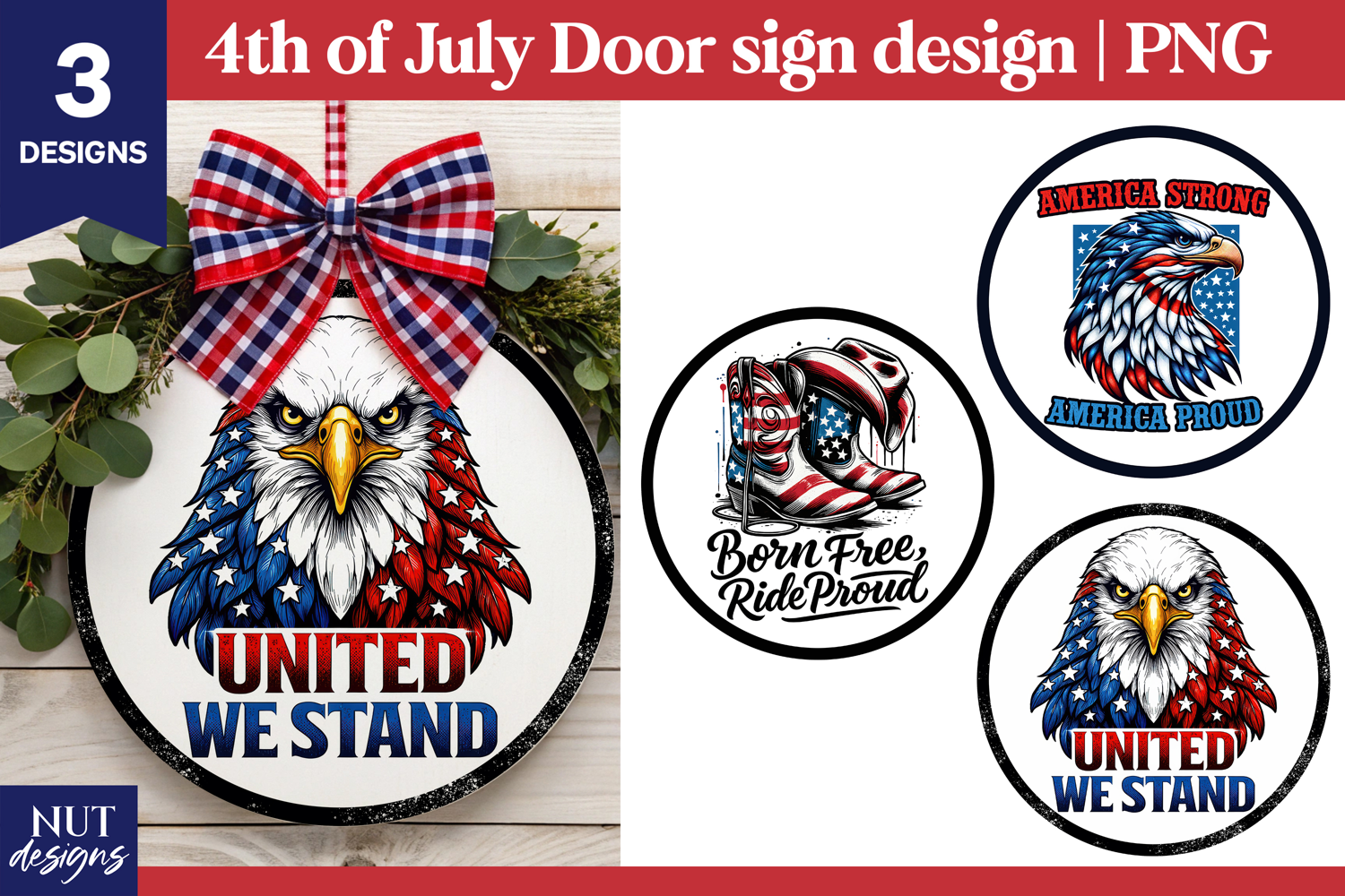 Celebrate the red, white, and blue with this patriotic door sign PNG bundle featuring three bold round designs for summer decorating. Includes a powerful eagle with united stand wording, a western cowboy boots design, and an America strong theme perfect for wreath sign projects, front porch displays, and holiday decor. Great for printable crafting, farmhouse style accents, and festive Fourth of July creations with classic American pride