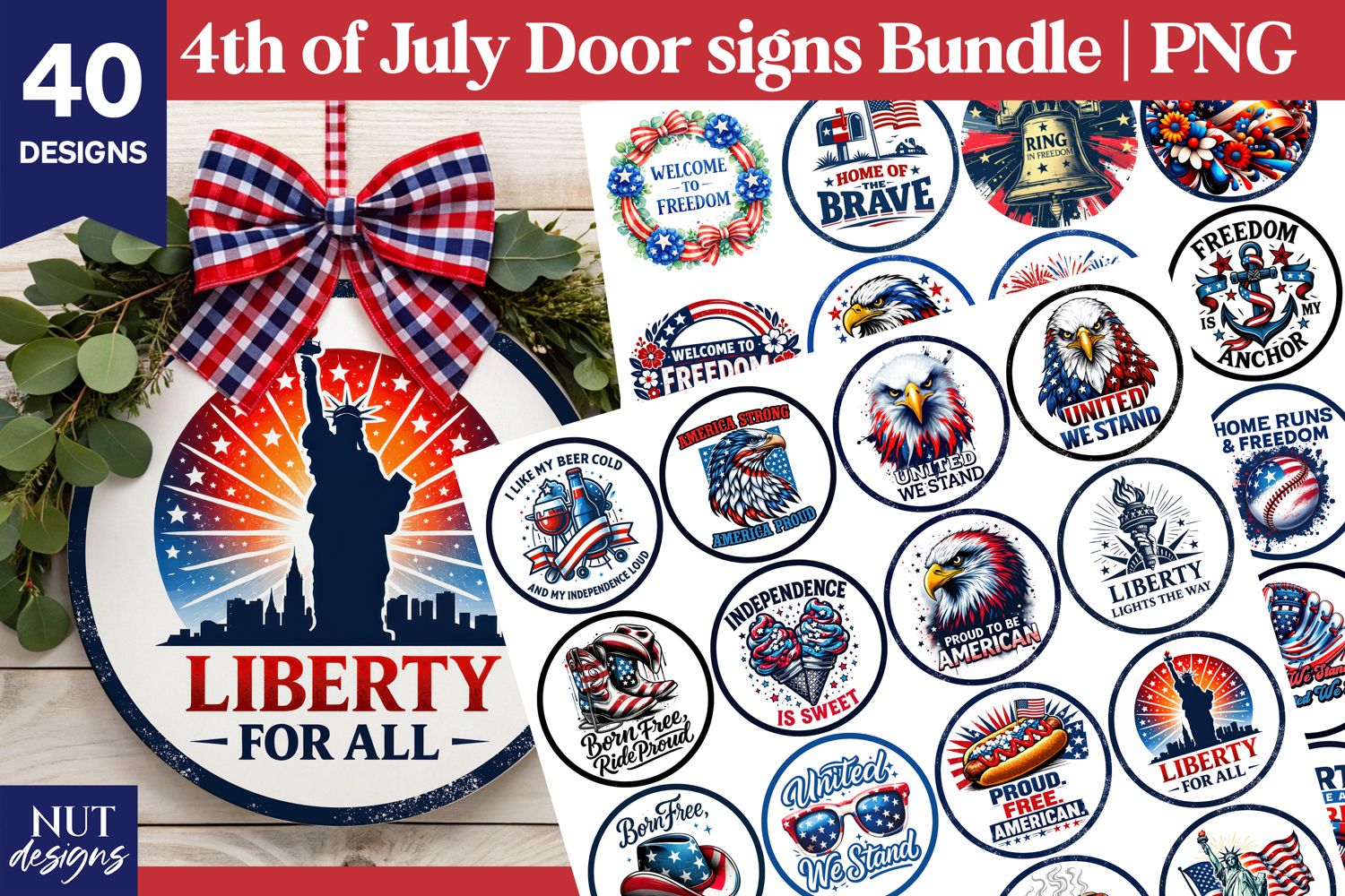 Celebrate the season with this 4th of July door signs bundle PNG featuring 40 patriotic round designs perfect for wreaths, porch decor, and front door displays. Packed with americana style, fireworks, eagle themes, liberty quotes, welcome signs, baseball, anchor, cowboy, and freedom-inspired artwork, this printable bundle is ideal for DIY door hangers, seasonal crafting, and festive summer decor with bold red, white, and blue charm