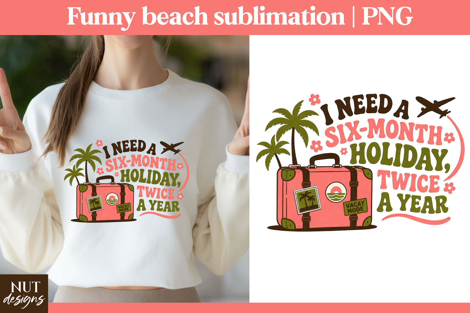 Add sunny humor to your next craft with this Six Month Holiday PNG featuring a retro travel quote, pink suitcase, palm trees, and airplane detail. Perfect for sublimation, printable projects, tshirts, tote bags, mugs, and digital designs. This funny beach vacation graphic brings tropical getaway vibes, summer fun, and wanderlust charm to every creation. A playful choice for crafters who love holiday humor, coastal style, and travel-inspired designs.