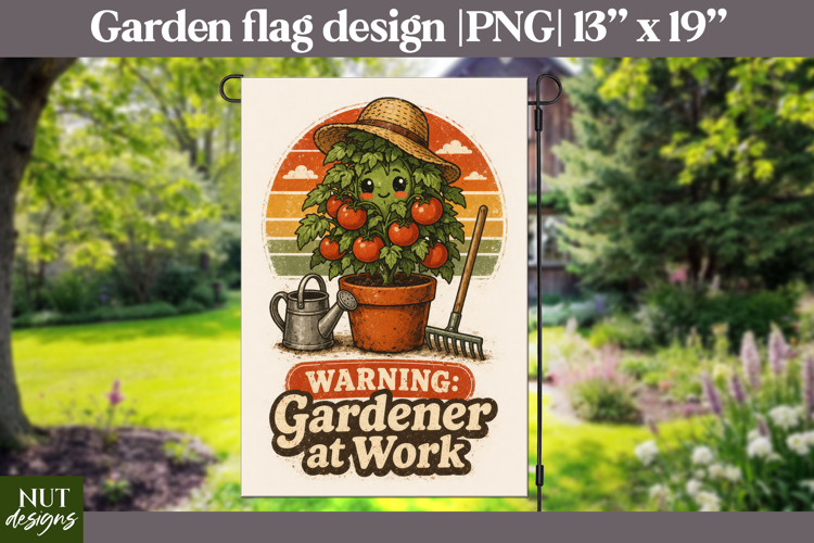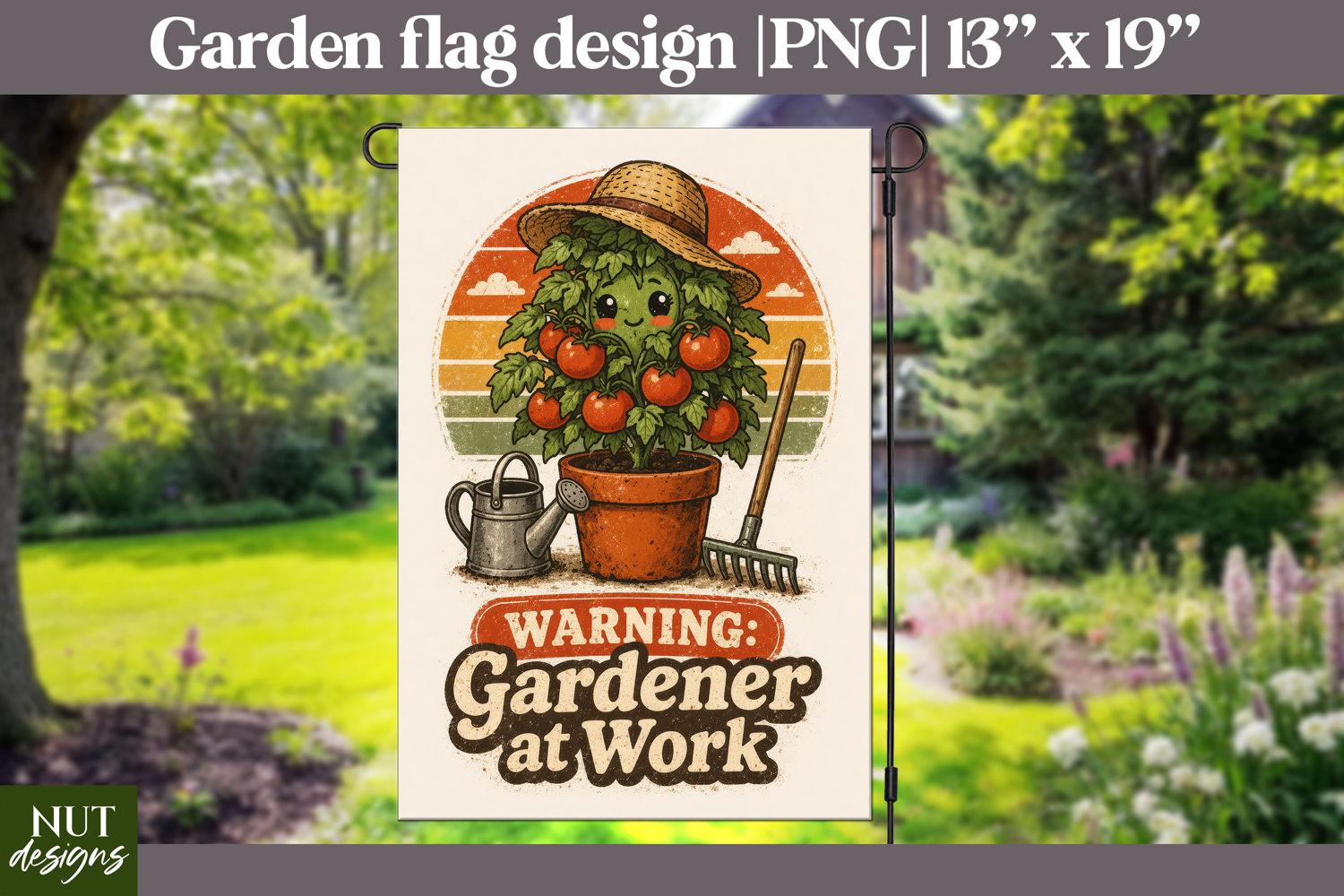 Brighten your outdoor decor with this Warning Gardener At Work PNG featuring a cute tomato plant in a pot, straw hat, watering can, rake, and retro sunset style. Perfect for sublimation, printable projects, garden flags, porch decor, and digital creations. This charming farmhouse-inspired design adds rustic summer garden vibes and playful personality to vegetable garden crafts, yard decorations, and seasonal handmade gifts.