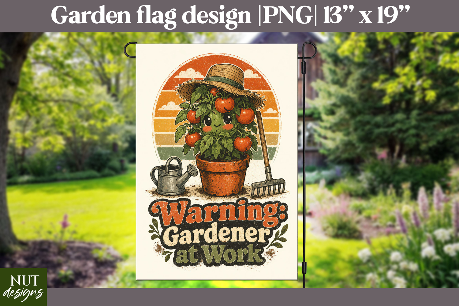 Brighten your outdoor decor with this Warning Gardener At Work PNG featuring a cute tomato plant in a pot, straw hat, watering can, rake, and retro sunset style. Perfect for sublimation, printable projects, garden flags, porch decor, and digital creations. This charming farmhouse-inspired design adds rustic summer garden vibes and playful personality to vegetable garden crafts, yard decorations, and seasonal handmade gifts.