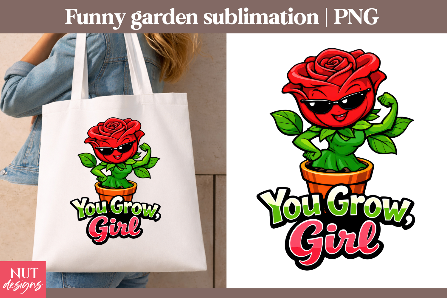 Add charm and confidence to your next craft with this You Grow Girl rose PNG. Featuring a cute cartoon flower in sunglasses with a fun feminine pun, this floral sublimation design is perfect for shirts, totes, mugs, stickers, and gifts. Great for gardening lovers, botanical projects, girl power themes, and playful handmade creations, this pink and red potted bloom brings cheerful style to your printable designs.