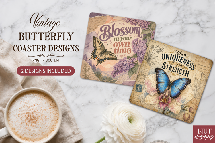 Add timeless beauty to your crafts with these vintage butterfly coaster designs featuring delicate florals, aged paper textures, and inspiring motivational quotes. With uplifting phrases like “Blossom in your own time” and “Your uniqueness is your strength,” these watercolor-style illustrations bring elegance, encouragement, and a soft romantic feel. Perfect for sublimation, printing, DIY decor, and thoughtful handmade gifts.