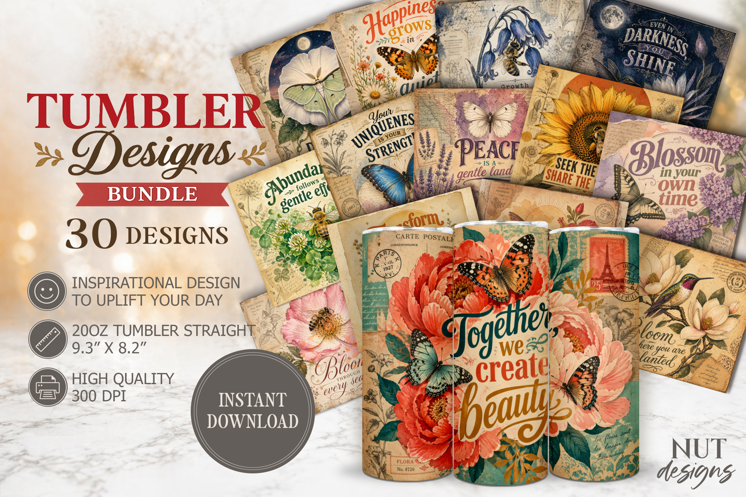 Elevate your creations with this vintage tumbler design bundle featuring a beautiful mix of butterflies, hummingbirds, florals, and botanical elements. Each watercolor-style design includes uplifting motivational quotes, bringing positivity and charm to your projects. Perfect for sublimation, printing, and DIY crafts, this collection offers variety, elegance, and inspiration for tumblers, gifts, and creative designs.