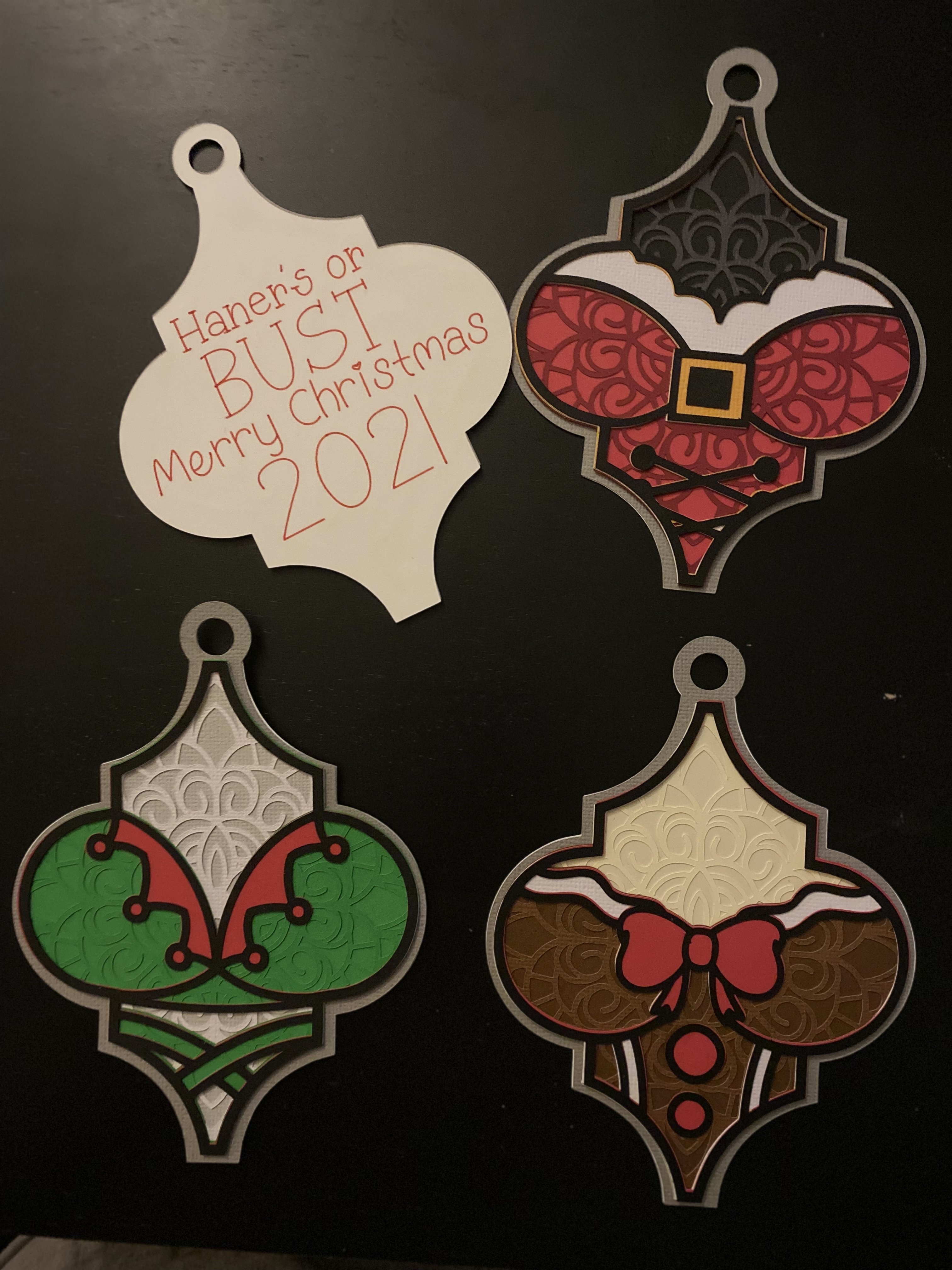 The ornaments included in this bundle are Elf Lingerie, Gift Wrap Lingerie, Gingerbread Lingerie, and Santa Lingerie!