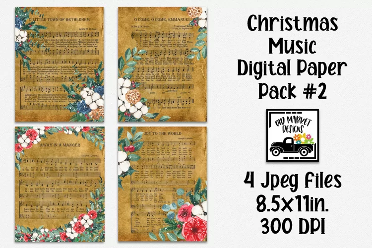 4 - 8.5" x 11" Floral Christmas Music Digital Paper, Jpeg Files, 300 dpi (These are digital papers, not overlays.)