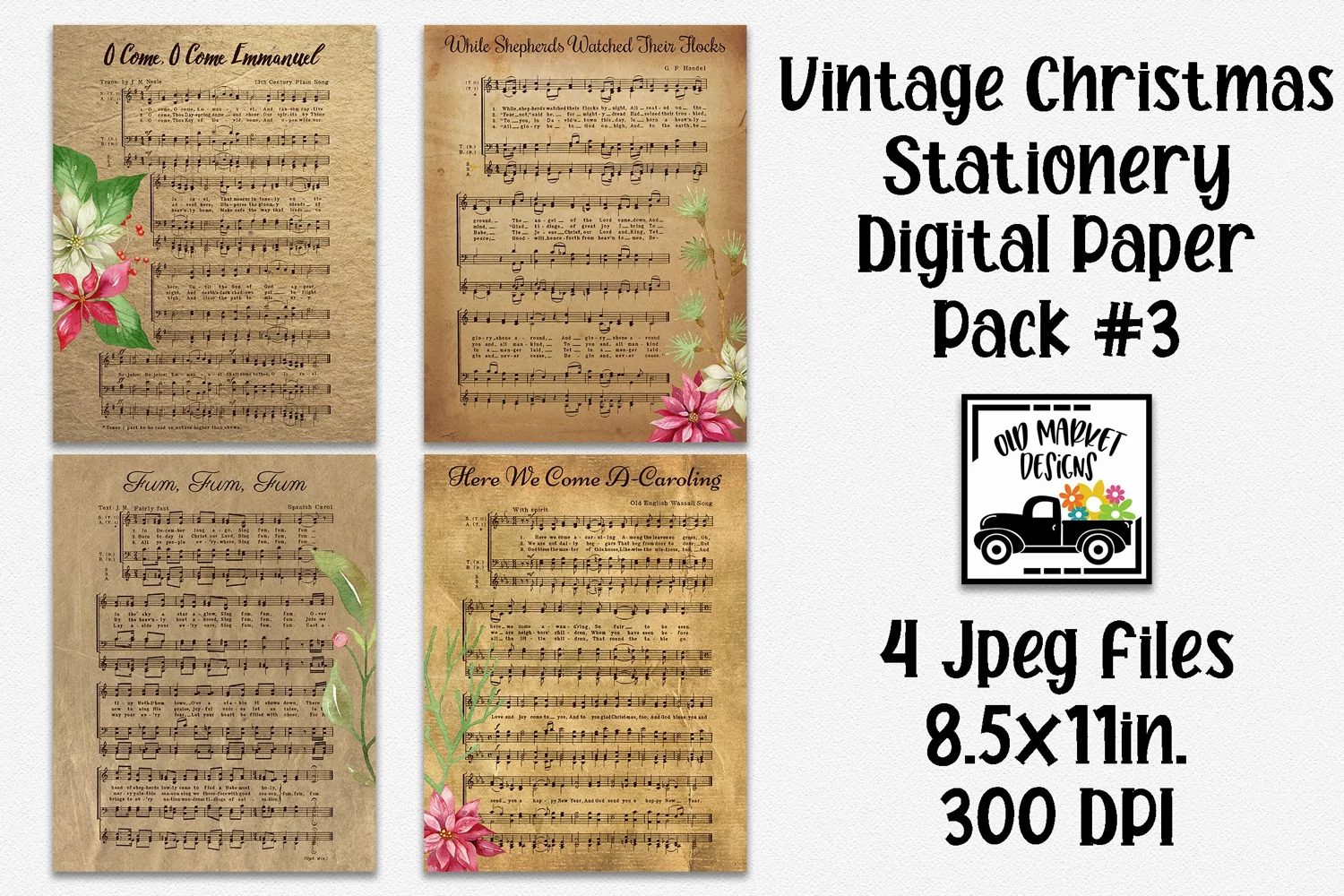 4 - 8.5" x 11" Vintage Christmas Music Digital Paper, Jpeg Files, 300 dpi (These are digital papers, not overlays.)