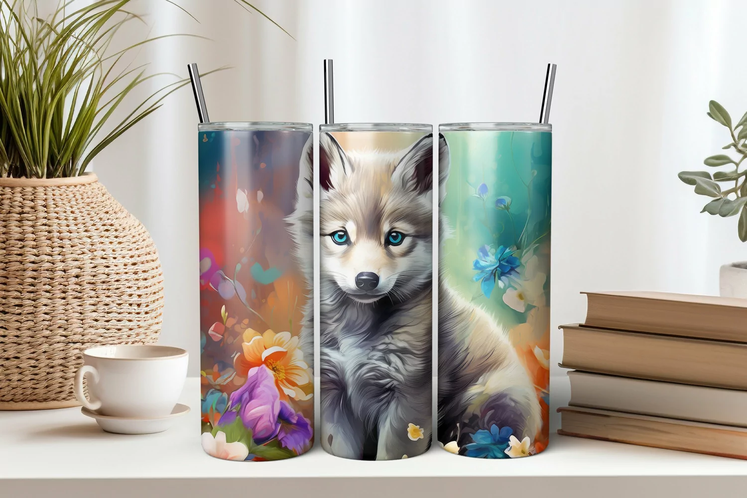 Baby Wolf and Flowers 20oz Tumbler Sublimation PNG