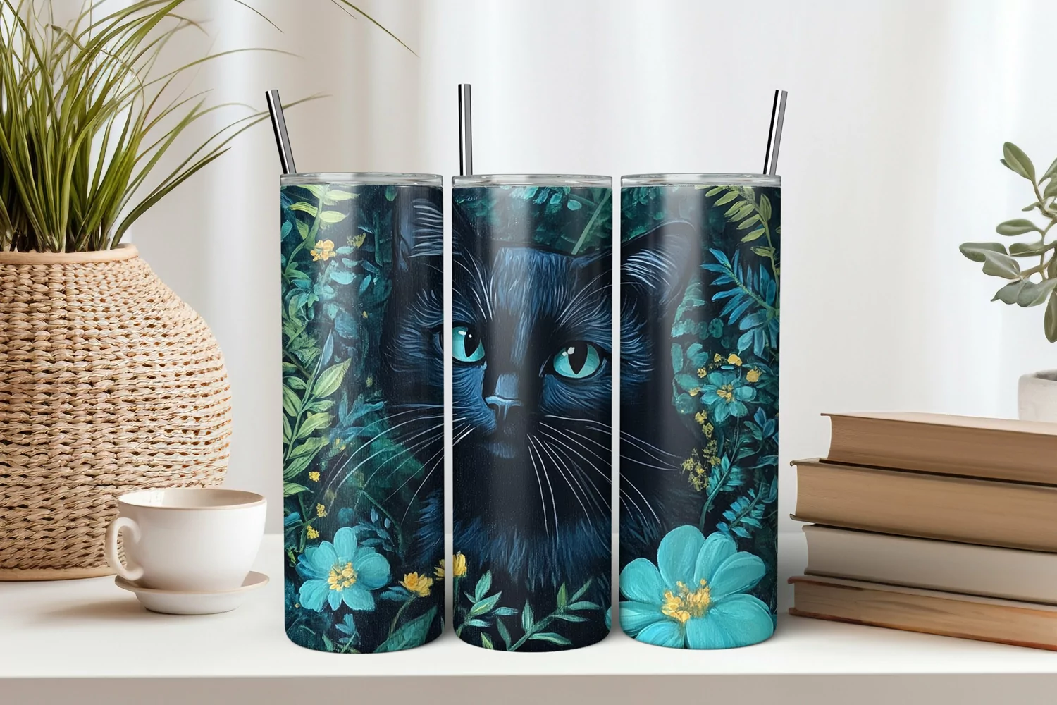 Black Cat with Blue Flowers 20oz Tumbler Sublimation PNG