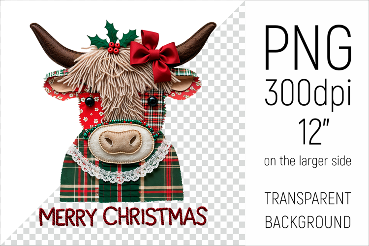 Merry Christmas Png Christmas Sublimation Design Vintage Christmas Decor Christmas Highland Cow Png Festive Cow Art Patchwork Cow Clipart Cozy Holiday Illustration Handmade Style Clipart Cute Winter Animal Png Fabric Applique Farm Animal