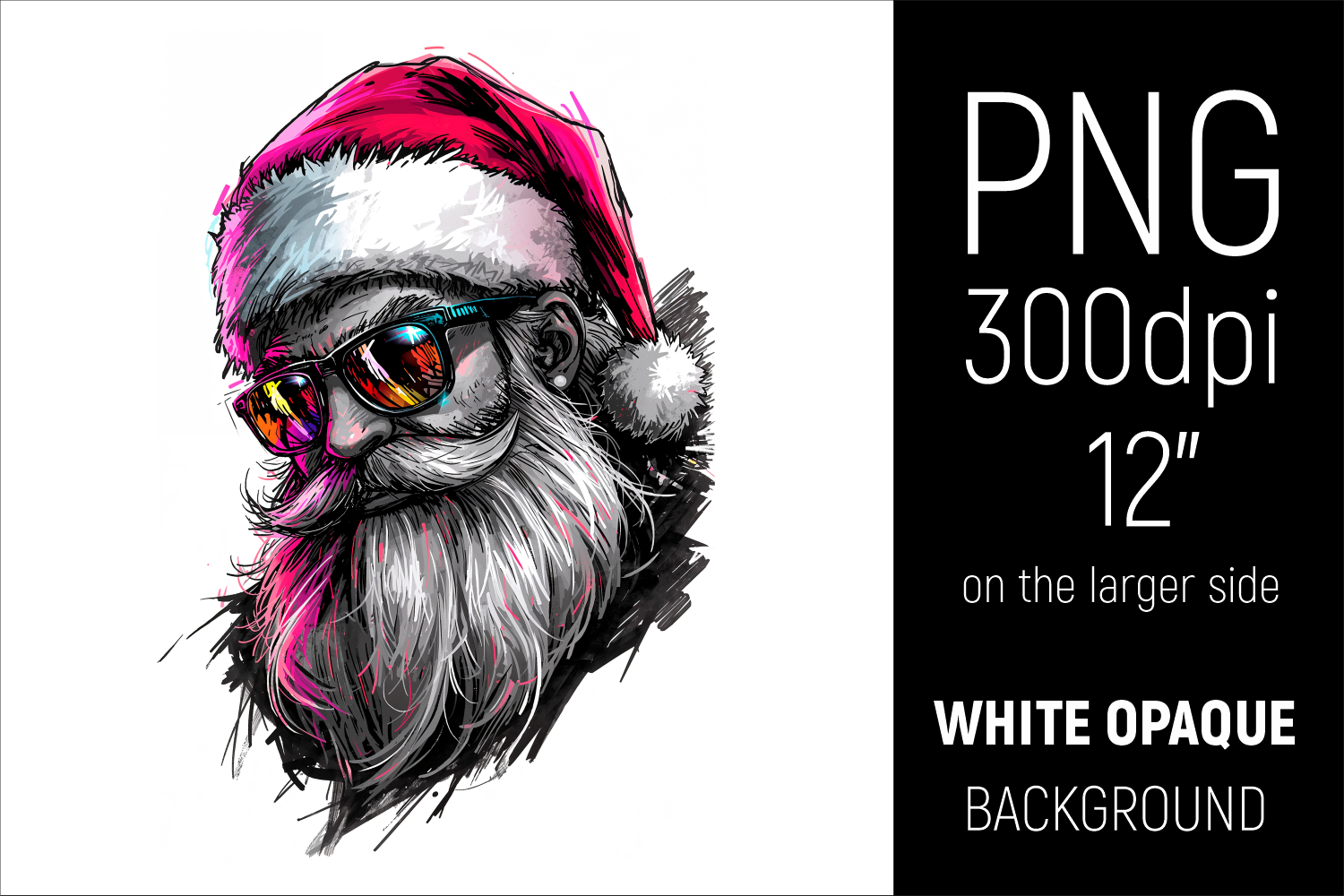 This high-resolution artwork features a stylish Santa Claus wearing a classic red hat and colorful reflective sunglasses, illustrated in a dynamic, edgy art style. Perfect for Christmas crafts, apparel printing, posters, cards, sublimation projects, stickers, and festive digital designs.