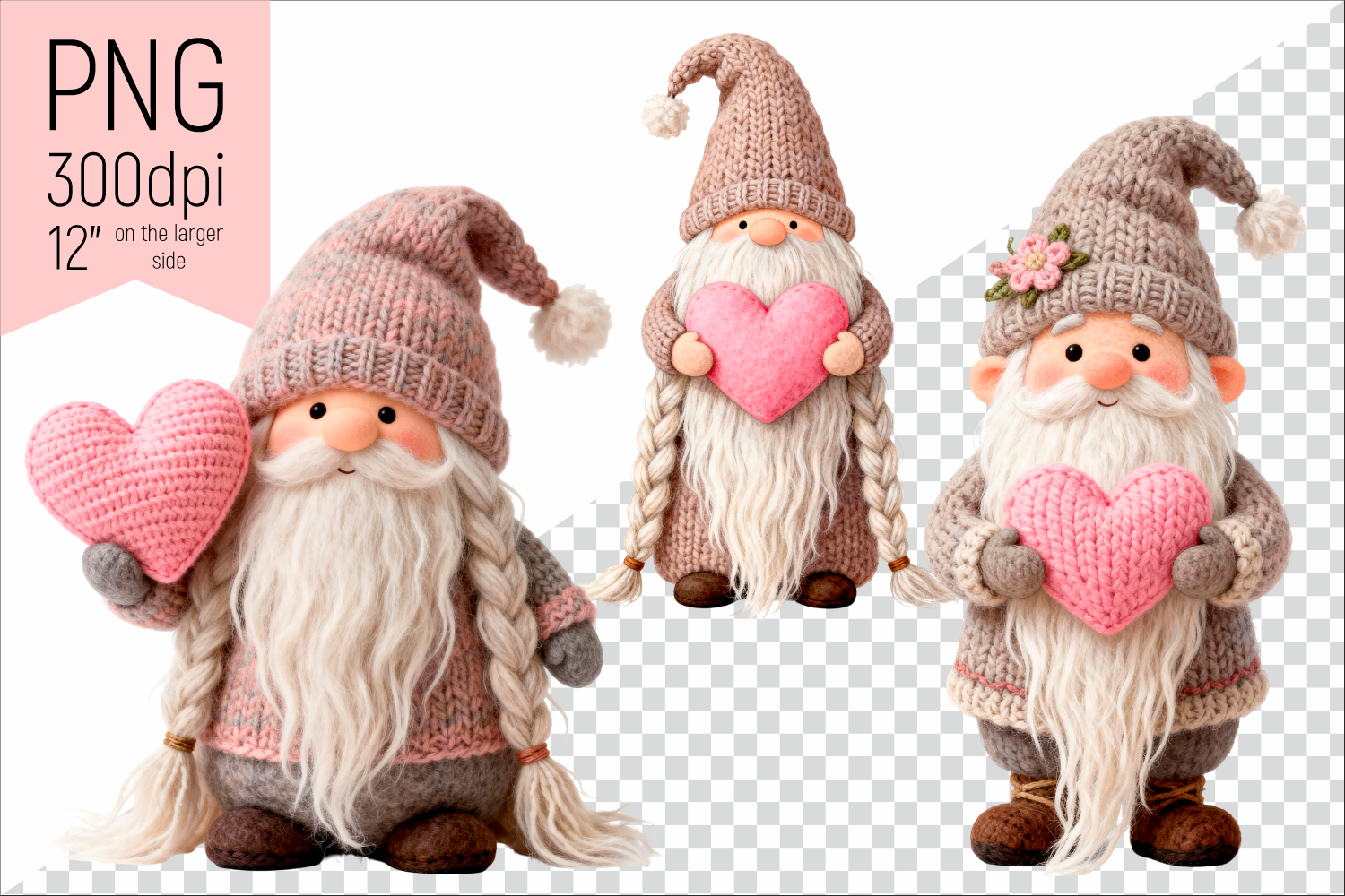 This Valentine gnome PNG set includes three adorable knitted gnomes holding pink hearts, designed in a cozy handmade yarn style.