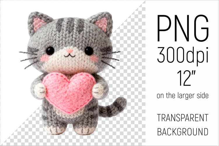 Knitted Valentine Cat with Heart Clipart. Ideal for sublimation projects, Valentines Day gifts, mugs, T-shirts, cards, stickers, scrapbooking, nursery decor, planners, and digital crafts.