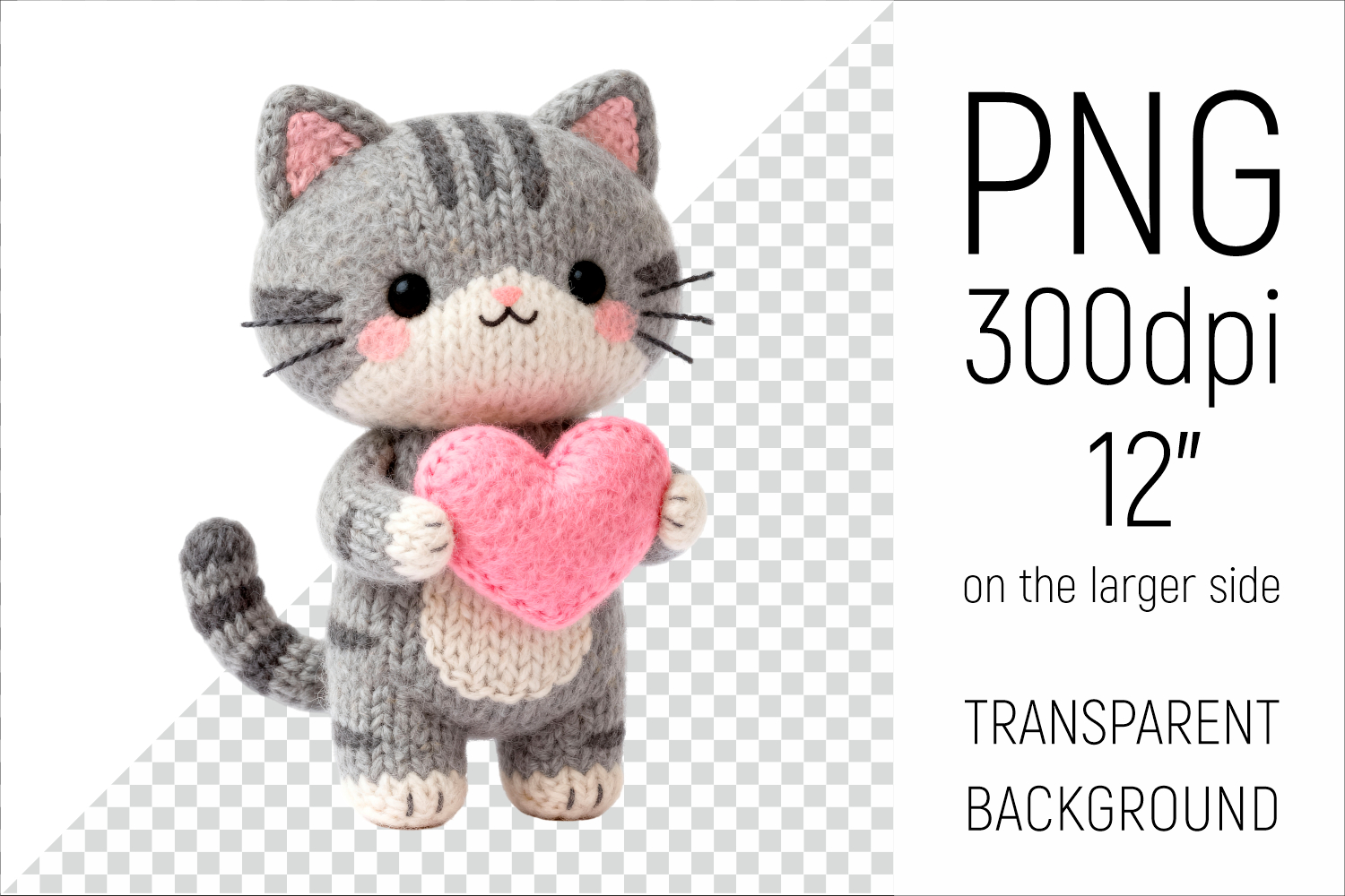 Knitted Valentine Cat with Heart Clipart. Ideal for sublimation projects, Valentines Day gifts, mugs, T-shirts, cards, stickers, scrapbooking, nursery decor, planners, and digital crafts.