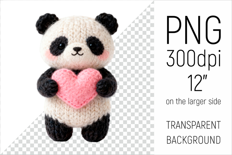 Knitted Valentine Panda Bear with Heart Clipart. Ideal for sublimation projects, Valentines Day gifts,  cards, stickers, nursery decor, and digital crafts.