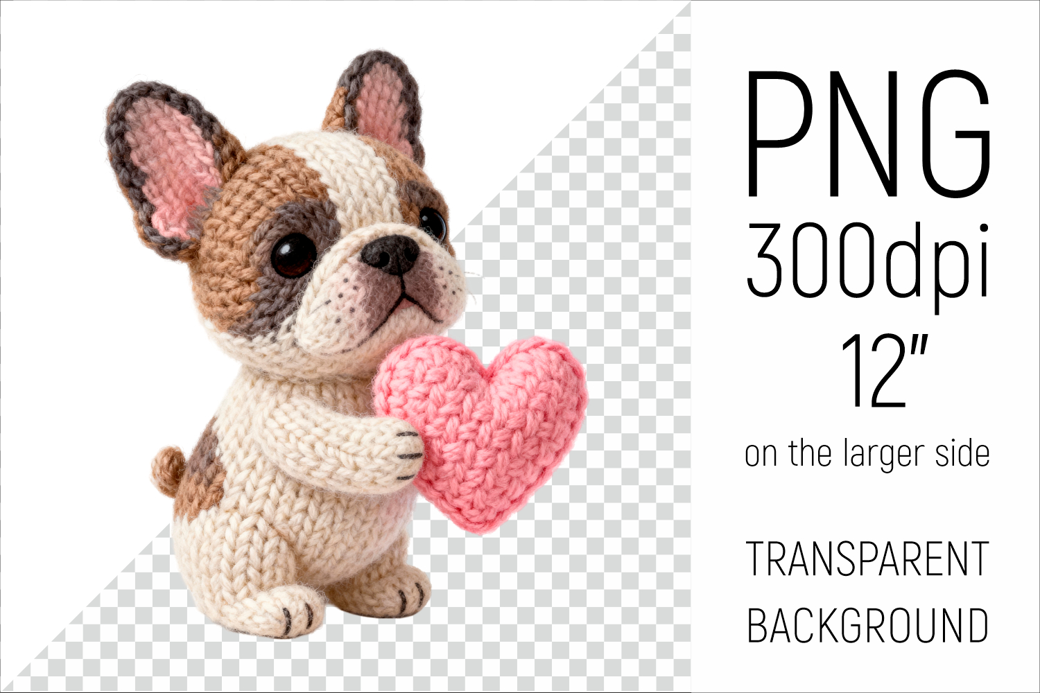 Knitted Valentine French Bulldog with Heart Clipart. Ideal for sublimation projects, Valentines Day gifts, mugs, T-shirts, cards, stickers, scrapbooking, nursery decor, planners, and digital crafts.