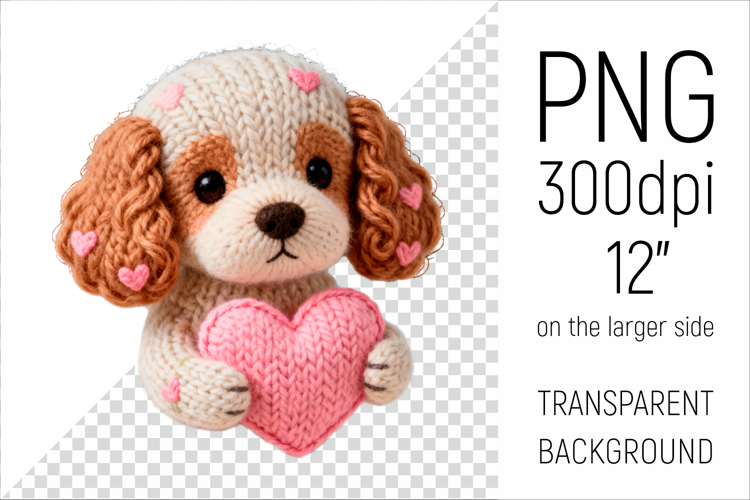 Knitted Valentine Spaniel with Heart Clipart. Ideal for sublimation projects, Valentines Day gifts, mugs, T-shirts, cards, stickers, scrapbooking, nursery decor, planners, and digital crafts.