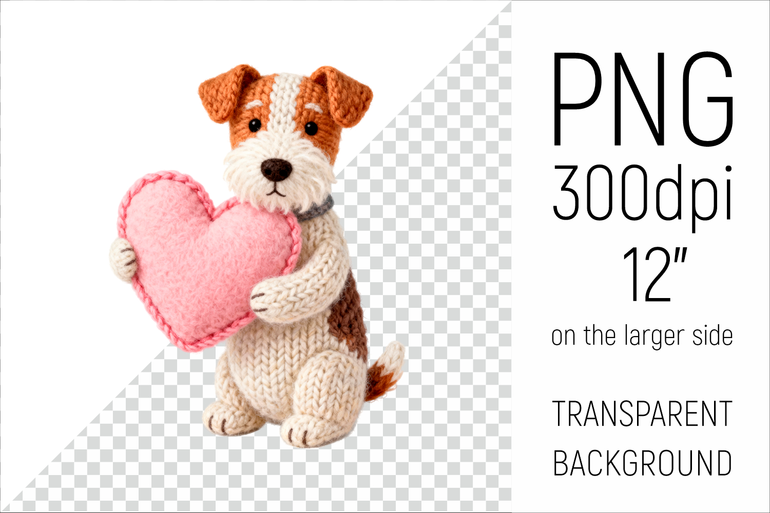 Knitted Valentine Foxterrier Dog with Heart Clipart. Ideal for sublimation projects, Valentines Day gifts, mugs, T-shirts, cards, stickers, scrapbooking, nursery decor, planners, and digital crafts.