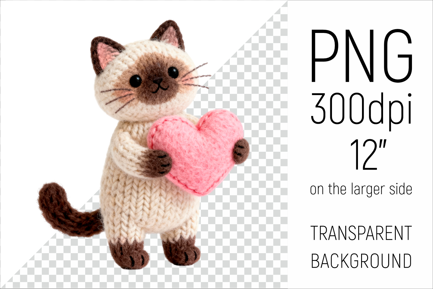 Knitted Siamese Cat with Heart. Valentine Clipart. Ideal for sublimation projects, Valentines Day gifts, mugs, T-shirts, cards, stickers, scrapbooking, nursery decor, planners, and digital crafts.
