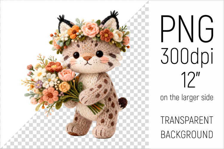 This adorable knitted Lynx  PNG features a sweet woodland Lynx  holding a beautiful bouquet of flowers and wearing a delicate floral crown. Designed in a cozy handmade yarn style, this charming illustration brings warmth and softness to any creative project.