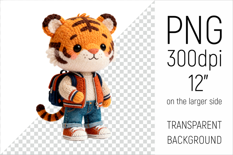 Knitted School Tiger  with Backpack Clipart. Perfect for school projects, graduation gifts, teacher appreciation designs, and educational materials.