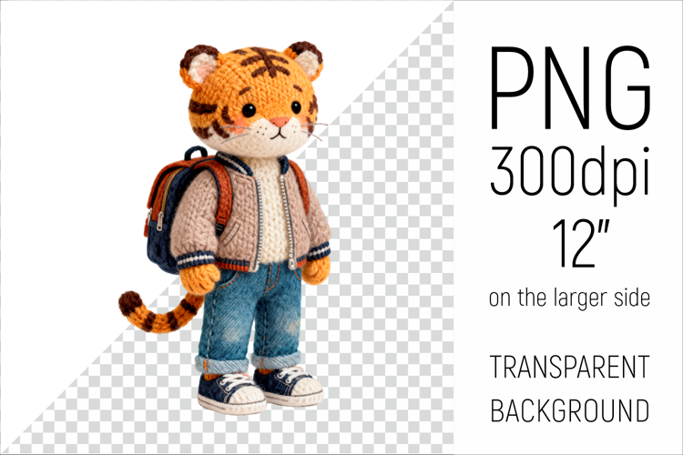 Knitted School Tiger  with Backpack Clipart. Perfect for school projects, graduation gifts, teacher appreciation designs, and educational materials.
