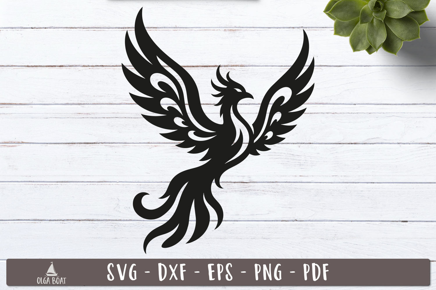 This phoenix silhouette SVG design showcases a bold and elegant mythical bird with sweeping wings and flowing tail details.