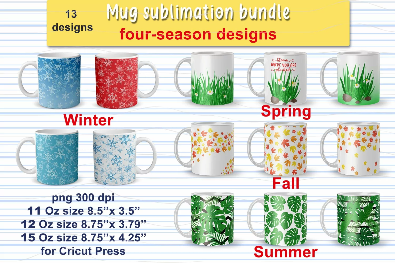 Four seasons Mug Sublimation bundle of 13 wraps, Winter, Spring, Summer and Fall designs for 11 oz, 12 oz, 15 oz mugs.