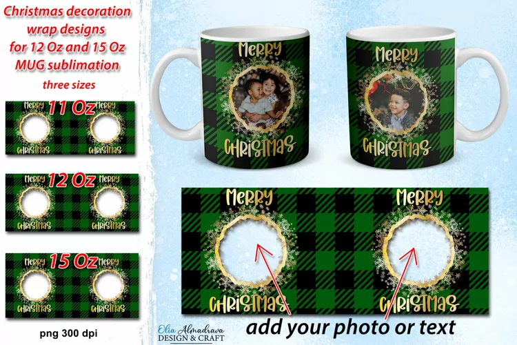 Christmas mug sublimation designs with buffalo plaid pattern and golden snowflakes for 12 oz, 15 oz mugs. Mug template in the PNG format with transparent place- you can add your Photo, monogram or text on layer behind the template. Festive Christmas backg