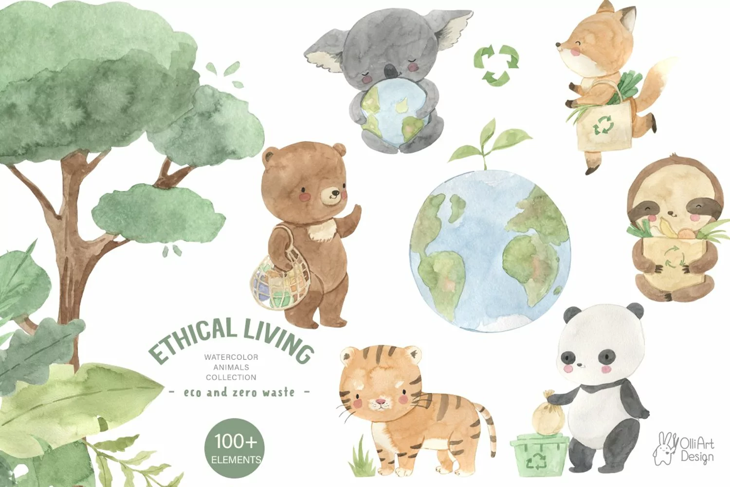 Similar Design Products to Animals watercolor clipart. Zero waste and eco