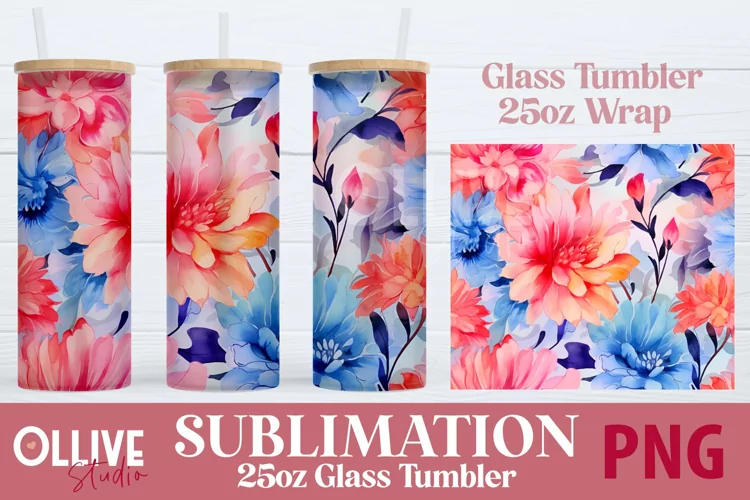 Watercolor Floral 25oz Glass Tumbler Wrap Sublimation PNG