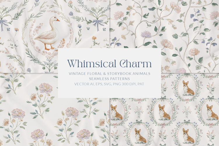 🌸 Whimsical Charm is a romantic collection of vintage-inspired seamless patterns designed to bring elegance, softness, and timeless storybook character to your creative projects.