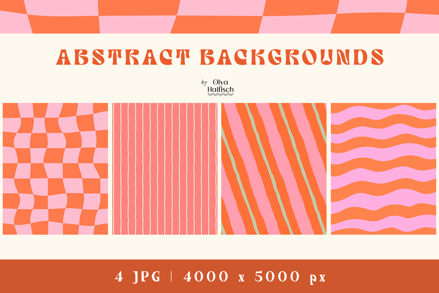 Elevate your designs with this bold and dynamic set of 4 abstract backgrounds, featuring vibrant, bright tones of pink and orange. The set includes groovy, hypnotic wavy checkerboard, vibrant diagonal stripes, wavy hand drawn stripes and whimsical hand drawn thin lines, blending retro charm with modern energy.