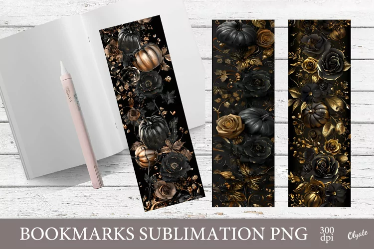 Gold Flowers Dark Halloween Gold Halloween Bookmark Png Halloween Bookmark Golden Pumpkin Bookmark Sublimation Gold Bookmark Mystic Halloween