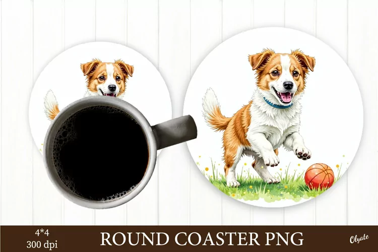 Cute Dog with Ball PNG. Round Coaster PNG example image 1