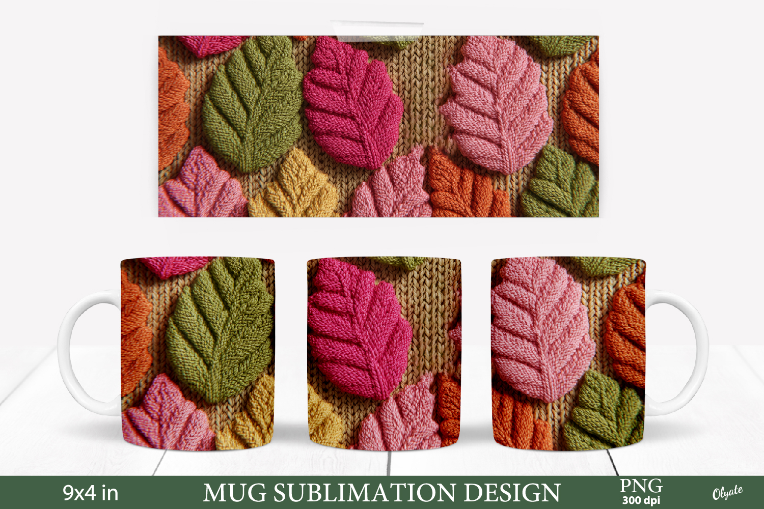 Cozy Fall Mug Sublimation Wrap. Knitting Leaves PNG example image 1