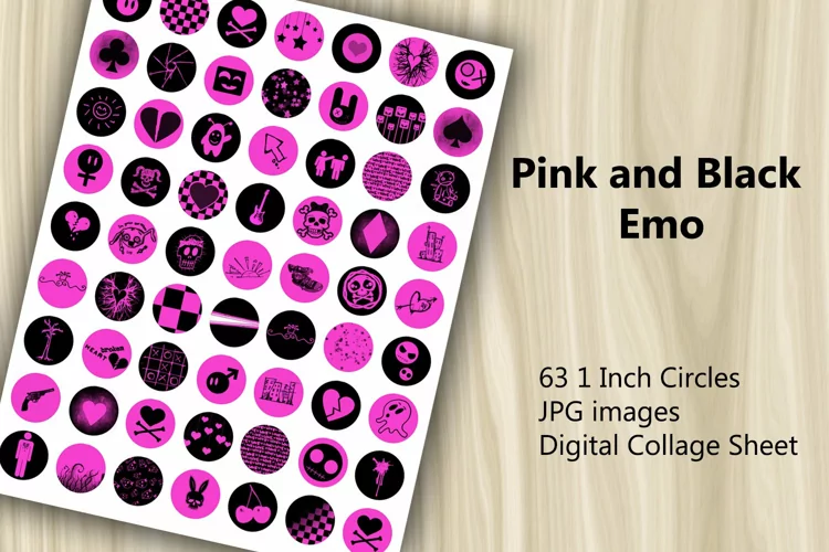 Digital Collage Sheet - 63 1 Inch Circles JPG images - Pink and Black Emo