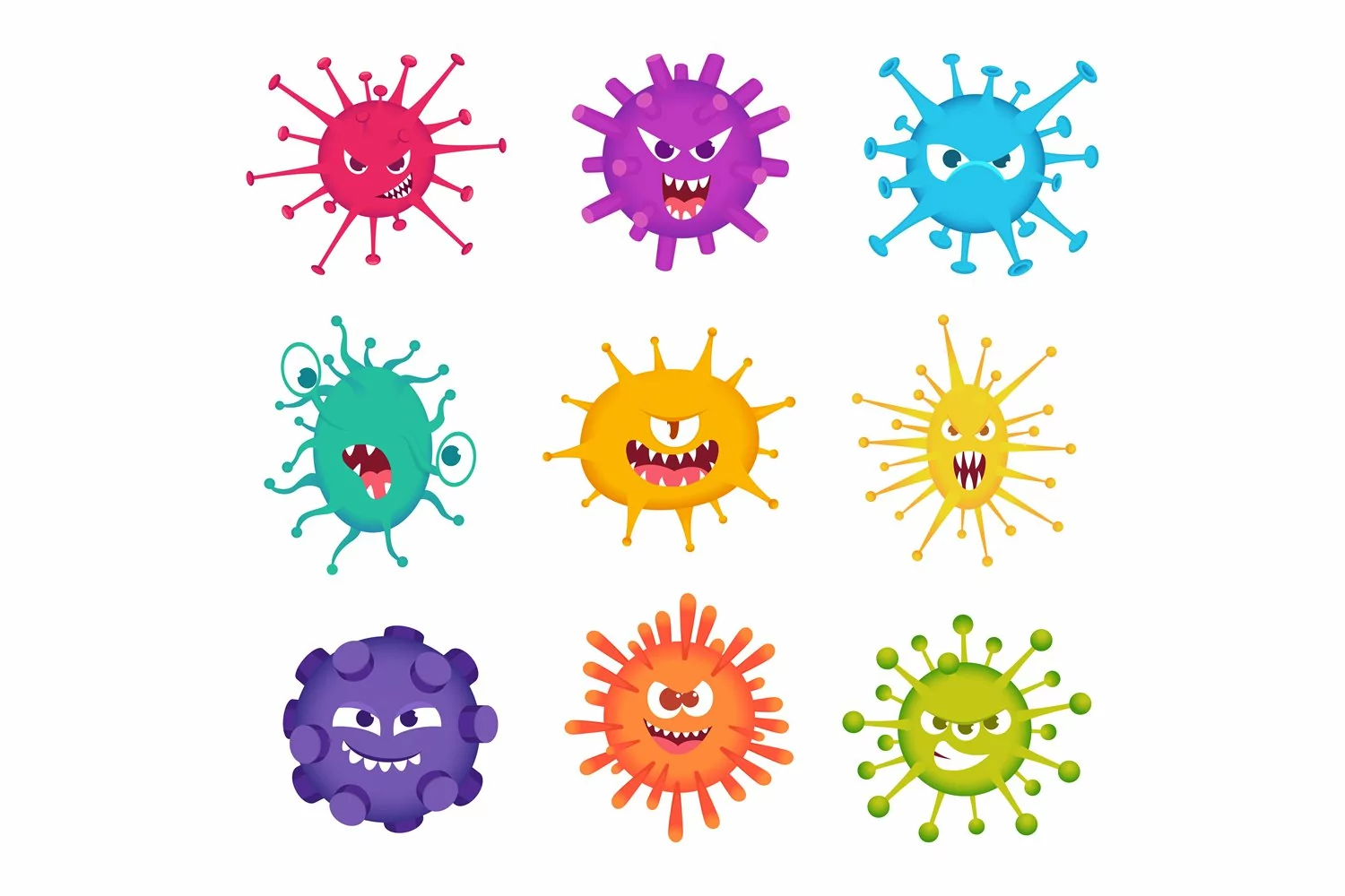 Virus faces. Medical characters bacteria mascot smiling monster pathogenic virus exact vector set. Illustration illness and influenza collection