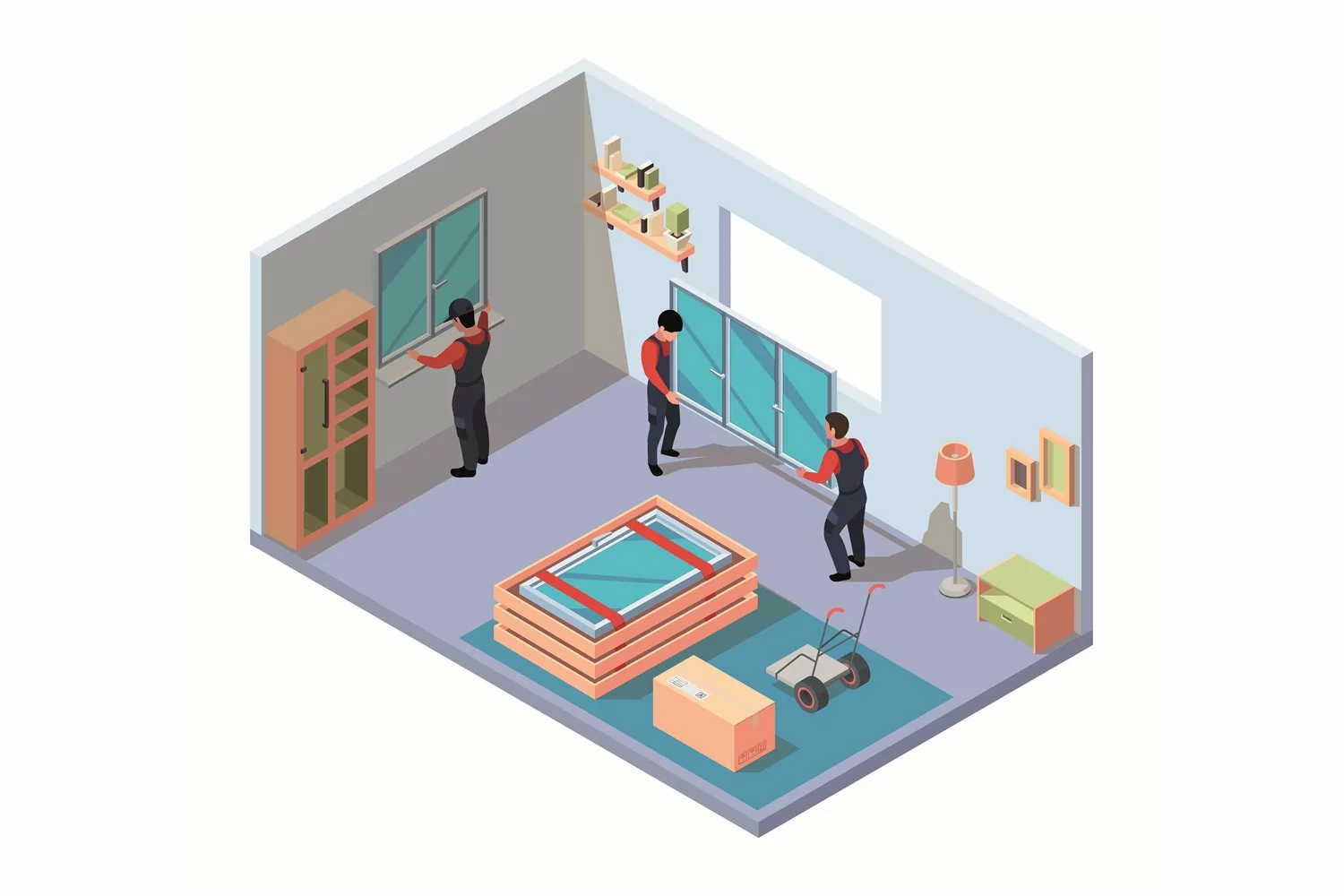 Interior renovation background. Workers installing plastic windows in modern room fix problems door frames repair processes vector isometric template. Illustration of install specialist and renovate
